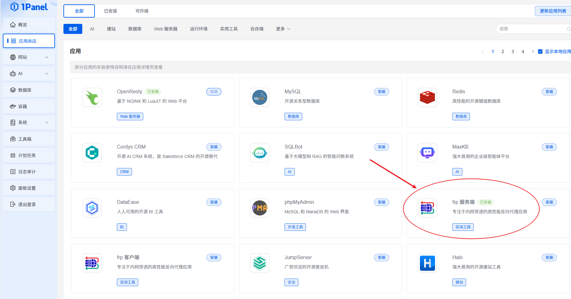 ########################################################### 2、阿里云服务器登录1Pannel,应用商店,安装frp服务端